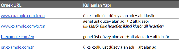 Türkiye’ de İngilizce konuşan kullanıcılar için örnek URL yapılarını aşağıda görebilirsiniz: