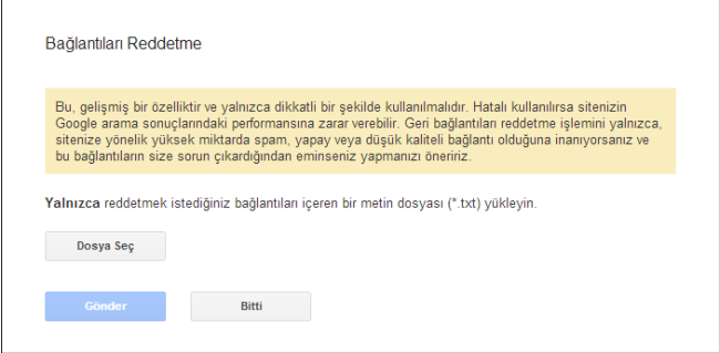 Yukarıyada belirtilen tool aracılığı ile yaptığımız tahlil sonrası Webmaster tools üzerinden disavow taşıtına giriş yapıyoruz irtibatlarını yalanlamak istediğimiz siteyi seçerek iletişimleri yalanlama kısmına tıklıyoruz. Karşımıza gelen ekranda Google bize “Bu, gelişmiş bir özelliktir ve sadece dikkatli bir biçimde kullanılmalıdır. Bu özellik yanılgılı kullanılırsa sitenizin Google arama neticelerindeki performansına hasar verebilir “ ihtarını verecektir ve altında hemen görünen iletişimleri yalanla kısmına tıklayacağız.