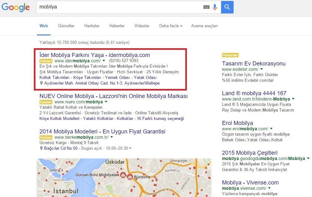 Arama ağı reklamları sayesinde internet kullanıcılarının Google arama motorunda arattığı kelimelere reklam vererek çekici reklam metniniz ile o kullanıcıları sitenize çekip satış ya da bilgi almasını sağlayan reklam biçimidir. Burada yapılacak optimizasyonların ise öneminde ayrıca bahsedeceğim. Aşağıda ki resimde arama ağı reklamcılığında aratılan kelime ile çıkan reklamı kırmızı çerçeve içinde gösterdim. Bu reklamlar sayesinde doğrudan satışını hedeflediğiniz kitleye ulaşabilir, ürününüzü ya da hizmetinizi hızlıca pazarlayabilirsiniz.