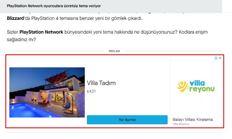 Gelelim görüntülü reklam ağına. Birçoğunuzun haber siteleri, spor siteleri, video siteleri vs. web sitelerinde gördüğünüz, flash ya da resim formatlarında olan görsel reklamlardır. Sağ üst köşesinde Google reklamları diye belirtilmektedir. Bu reklamlar sayesinde hedeflediğiniz kullanıcılara web sitelerinde görsel reklamlarınızı sunmanızı sağlamaktadır. Bu vesile ile kullanıcıların dikkatini çeken reklamlar sayesinde satışlarınızı hızla arttırmanız mümkündür. Bu reklam biçiminde ise yapacağınız hedeflemeler çok önemlidir. Örneğin, kullanıcıların ilgi alanları, kullanıcıların gezdiği siteler, kullanıcıların arattığı anahtar kelimeler gibi seçeneklerden faydalanabilirsiniz. Aşağıda yine bir Google görüntülü reklam ağı örneğini kırmızı kutu içerisinde gösterdim.