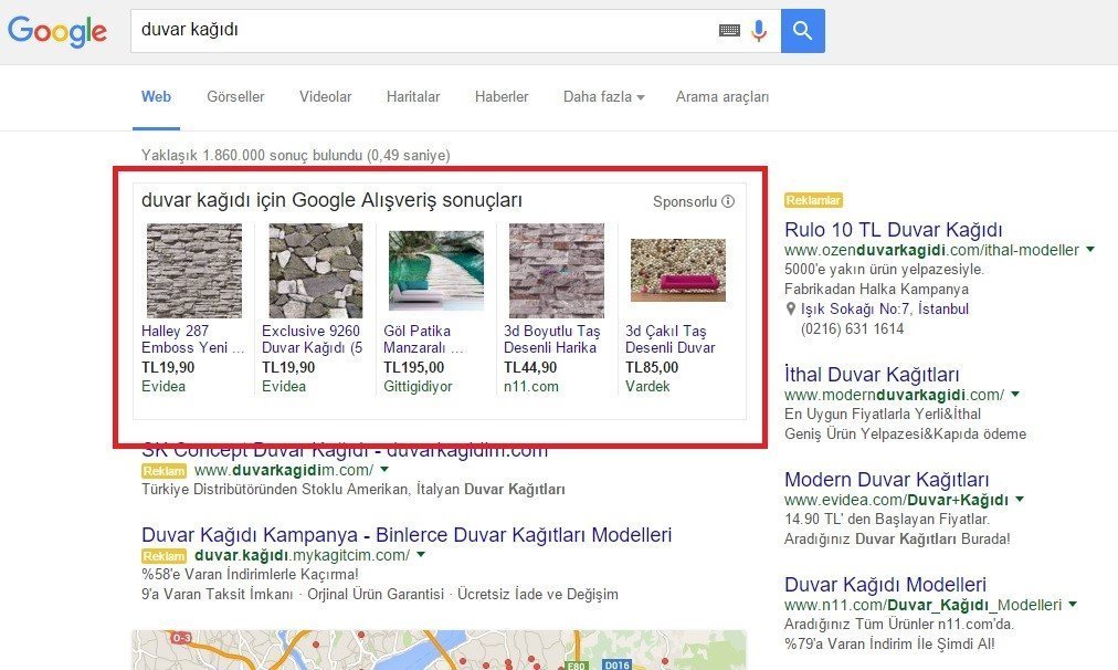 Gelelim PLA (Ürün listeleme reklamları)’na. Bu reklam biçimi E-ticaret sitelerinin vazgeçilmezidir. Eğer bir e-ticaret sitesiyseniz ve ürünlerinizi direk olarak Google aramalarında listelemek istiyorsanız doğru tercih PLA’dır. Bu reklam biçiminde ki mantık ise web sitenizde ki ürünleri bir feed aracılığı ile Google’da listelemek. Burada yapacağınız reklama bu ürünleri hedefleyip arama sonuçlarında listelenmesini sağlamaktır. Aşağıda ki görselde arama sonuçlarında listelenen ürün reklamlarının görüntüsü mevcuttur.