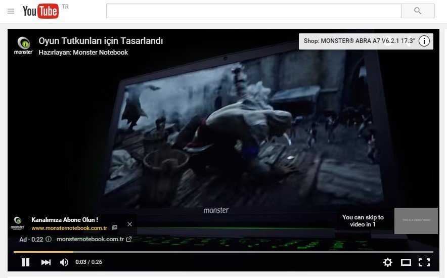 Bu reklam biçimini youtube izleyicileri “Skip to video” seçeneğine tıklayarak geçebilir ya da tıklamaz ise reklam bittiğinde izlemek istediği videoyu izlemeye devam edebilir. Bu videoda youtube kanallarını, youtube videolarını, görüntülü reklamda yaptığımız gibi ilgi alanlarını vs. hedeflemek mümkündür.