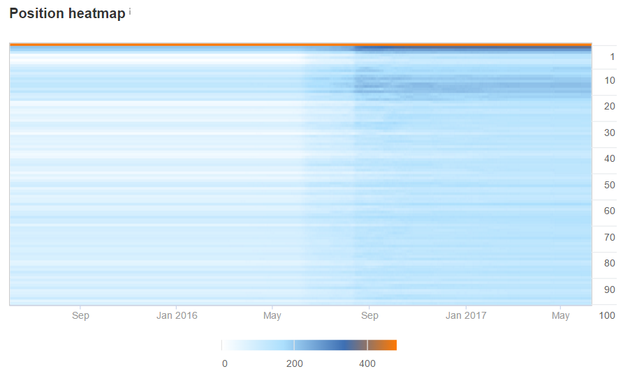 Görsel 2: Ahrefs kelime konumu ısı haritasının zaman içinde değişimi. Koyu renk olan bölgeler sitenin sıralama aldığı konumların sıklığını gösterir. Yatay çizgi sıklığı zaman içerisinde üst konumlarda yer alınan kelime sayısının yükseldiğini göstermektedir.