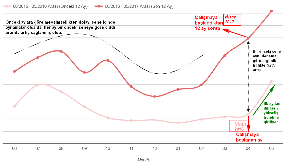 Görsel 3: Son 12 aylık dönem (koyu kırmızı çizgi / Haziran 2016 – Mayıs 2017) ve önceki 12 aylık dönemin (açık kırmızı çizgi / Haziran 2015 – Mayıs 2016) organik trafik karşılaştırması. Yıllık karşılaştırmaların kolay şekilde yapılmasına olanak verdiği için çalışmaların etkisi daha rahatça gözlemlenebilir.