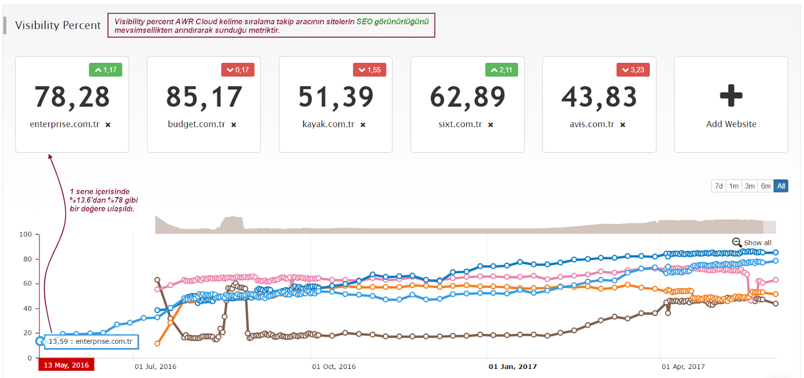 Yıllık karşılaştırma bize araç kiralama sektöründeki yüksek mevsimsellik etkisini dışarıda tutarak bir gözlem yapma imkanı sunuyor. O yüzden buradaki değerlendirmeleri bir önceki aya göre artış ve azalışları okuyarak değil, yıllık verilere göre veya organik trafik yerine mevsimsellikten arındırılmış metriklere göre yapmak daha sağlıklı ve faydalı olacaktır. Örnek olarak sıralama takibi için kullanılan AWR Cloud aracının mevsimsellik etkisi olmadan SEO görünürlüğü takibi sağlayan Visibility Percent metriğine göre de proje başladığından bu yana düzenli bir yükseliş trendi yakalandı ve önemli rakiplerle olan SEO görünürlüğü farkı kapatıldı; hatta çoğu geçildi.