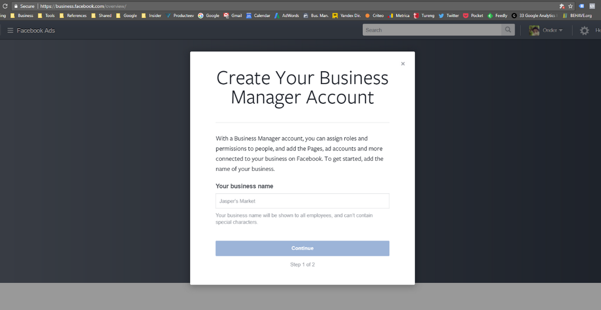 4. Daha sonra gelen popup pencerede şirket isminizle giriş yapın. Burada genelde birçok sayfa ve reklam hesabı aynı Business Manager’ın altında olabileceğinden kapsayıcı çatı bir isim seçilir. Örneğin “Yeni Mahalle Evleri” veya “Modern Garden” gibi birçok projesi olan ve bu projeler için birçok Facebook sayfası olan bir ABC İnşaat adında bir şirketseniz Business Manager isminizi ABC İnşaat olarak seçmek yerinde olacaktır.