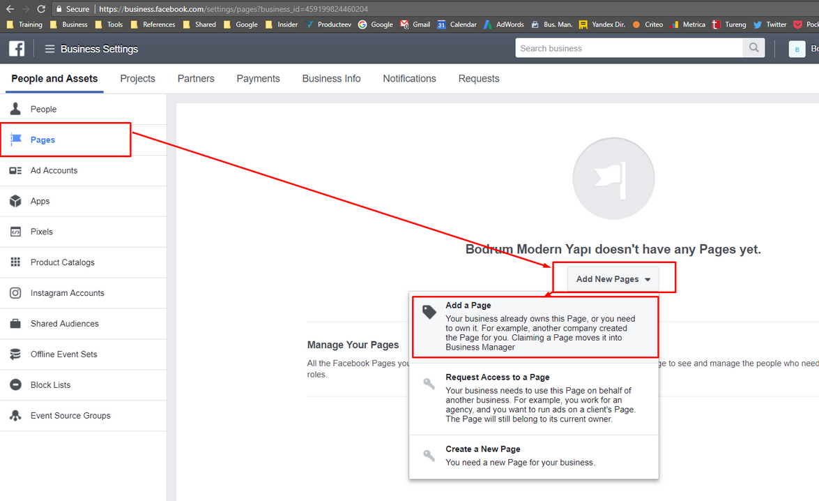8. İşletme Ayarları sayfasında sol tarafta Pages (Sayfalar) menüsüne gelerek Add a Page (Sayfa Ekle) sayfa ekle seçeneğini seçin ve kendi sayfanızı buradan ekleyin. Sayfanızın halihazırda yöneticisiyseniz doğrudan onaylanacaktır.