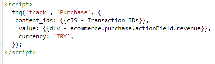 “content_ids (ürün id numaraları)” “Custom javascript” değişken tipi ile tanımlanan bir array halinde çekilmektedir. “value (fiyat)” değeri ise datalayer yapısından çekilmektedir.