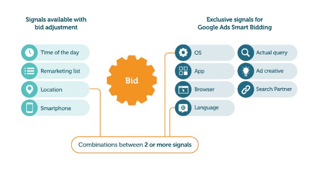 Akıllı teklifler, açık arttırmalar da son tüketicinin satın alma amacına göre(intent) göre anlık teklif vererek kampanyanın performansı artırır. Google Ads teklif verme algoritmaları, açık artırma anında mevcut olan alakalı sinyalleri kullanarak teklifleri her kullanıcının benzersiz arama bağlamına göre düzenler.