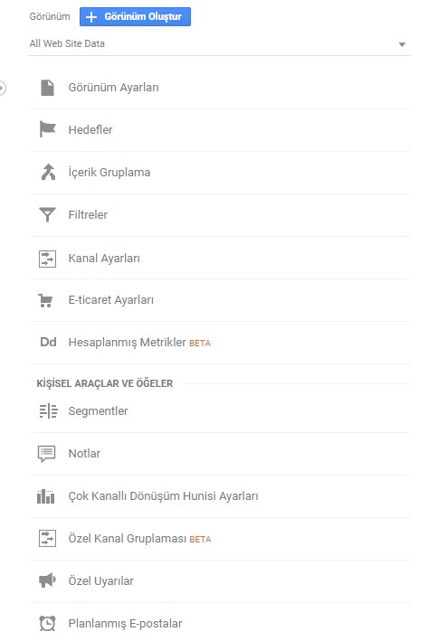 Segmentler rapor sayfalarındaki “+ Yeni Segment” butonundan tanımlanabildiği gibi “Yönetici” panelinden de tanımlanabilir. “Yönetici” panelindeki “Görünüm” sütununun altında “Segmentler” seçeneği de tüm segmentlere ulaşılabilen ve yeni segmentler tanımlanabilen bir yoldur.