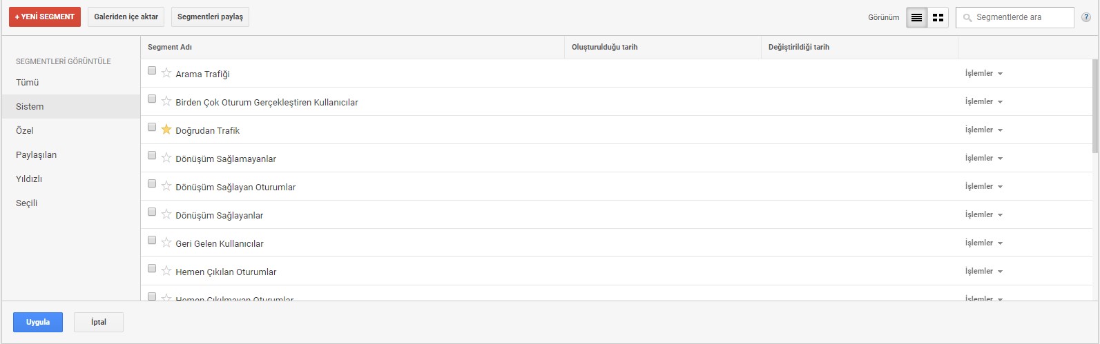 “Segment Ekle” butonuna tıkladıktan sonra açılan listeden bir segment seçilir. Seçilen bu segment Analytics raporlarına uygulanır. Segment listesi çeşitli kategorliere ayrılmış vaziyettedir. Çok segment bulunan bir görünümde uygulanmak istenen segmentin bulunabilmesi bu kategoriler aracılığıyla rahatça bulunabilir. Segmentlerin rahat bulunabilmesinin bir yolu da sık kullanılan bir segmentin isminin yanındaki yıldız ikonu ile işaretlenmesidir. Bu sayede aranan segmentler, segment listesinden kolayca bulunabilir ve uygulanabilir. Analytics 360 üyeliği olmayan bir hesap altındaki görünümde en fazla 100 segment tanımlanabildiği unutulmamalıdır.