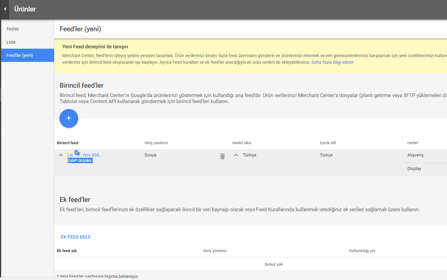 Eski versiyonda ürünlerinizin bilgisini yalnızca tek bir feed ile yolluyordunuz. Yeni versiyonda ise ek feed’ler aracılığı ile mevcut ilk feed’inize yeni özellik ve bedelleri ilave edebilirsiniz. Ayrıca bu imkânına da sahipsiniz.