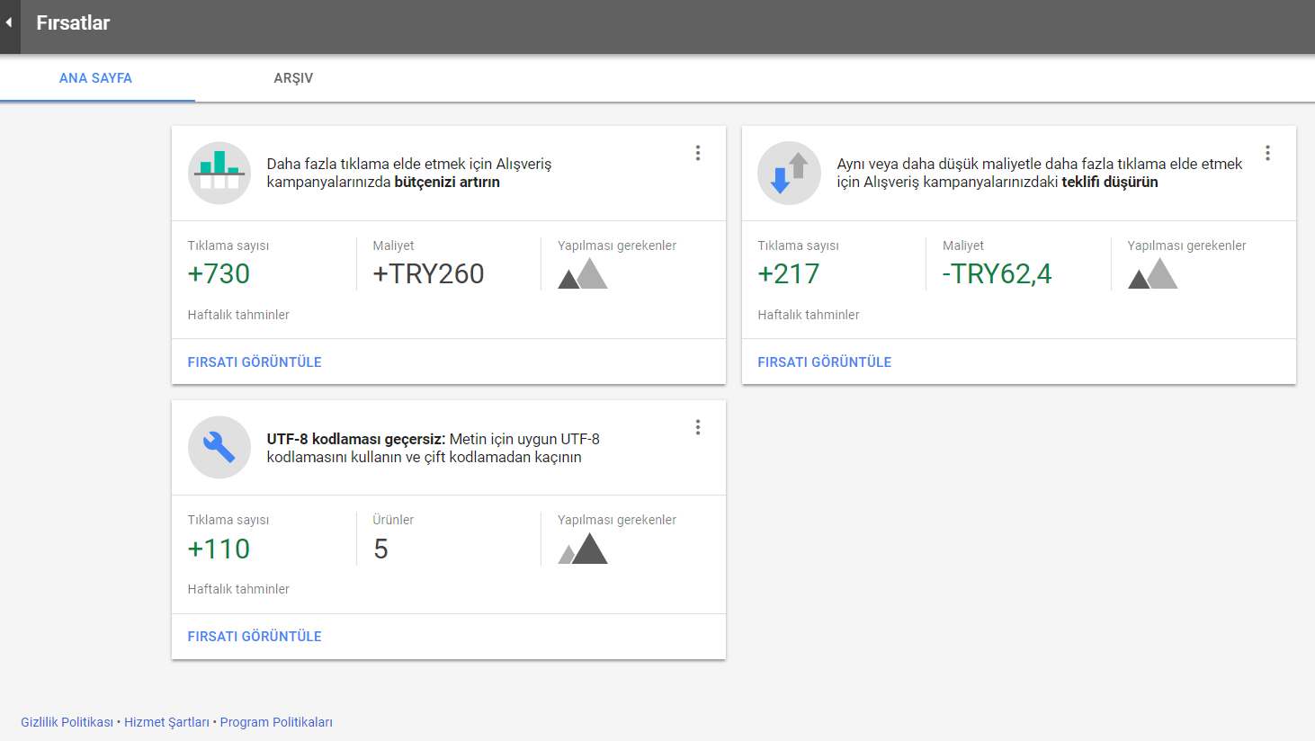 Google Adwords’te olduğu gibi artık Merchant Center arayüzünde de fırsatlar sekmesi mevcuttur. Fırsatlar sekmesi sayesinde ürün bilgilerinizi veya kampanyalarınızı geliştirmek için yapmanız gerekenler hakkında fikir edinebilirsiniz. Merchant Center hesabınızı oluşturduktan sonra Google algoritmasına göre yeterli bilgiler elde edildiğinde Fırsatlar sekmesinde yeni fırsatlar sunulacaktır.