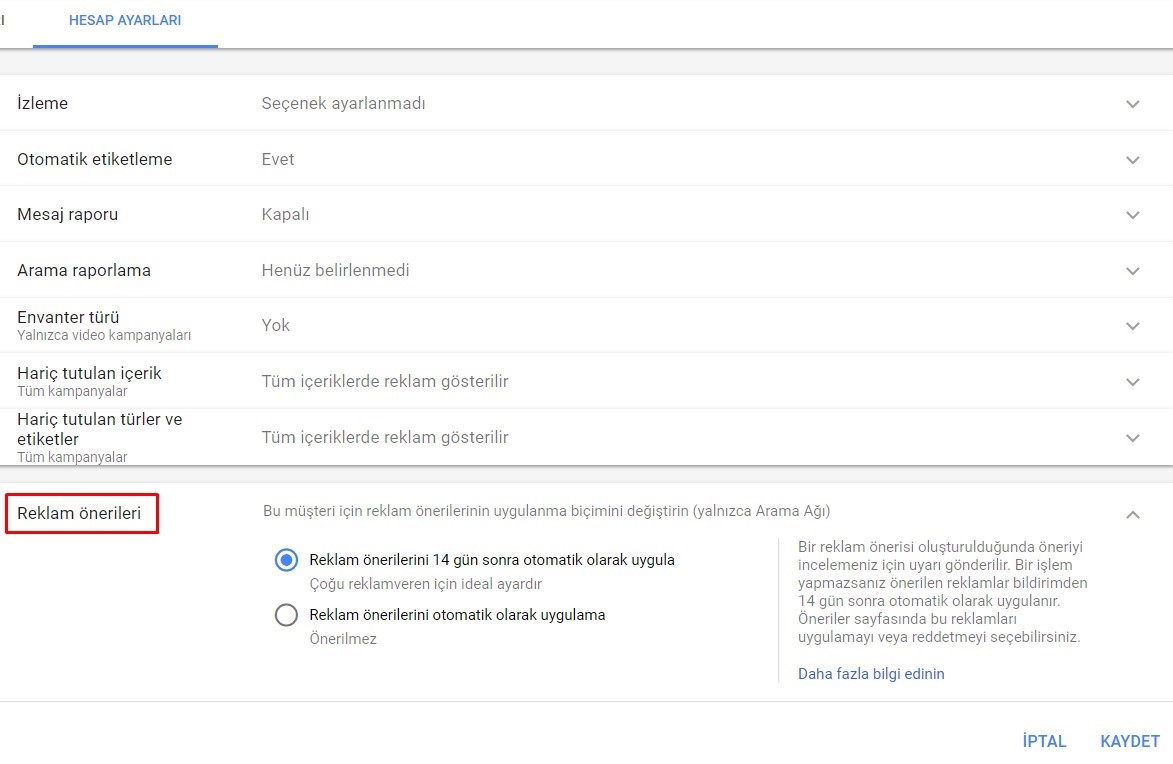 Tüm hesaplara zannedilen olarak gelen bu özelliği yeni Google Ads Oturumunda devre dışı vazgeçmeniz olası. Otomatik olarak uygulamayı devre dışı vazgeçmeniz için yapmanız gereken: Ayarlar menüsünden, Hesap Ayarları’nı seçip, ‘teklifleri 14 gün sonra otomatik uygula’ alternatifinin zannedilen olarak ayarlandığı hesap ayarı seçimini, ‘Reklam tekliflerini otomatik olarak uygulama’ alternatifi ile değiştirmek.