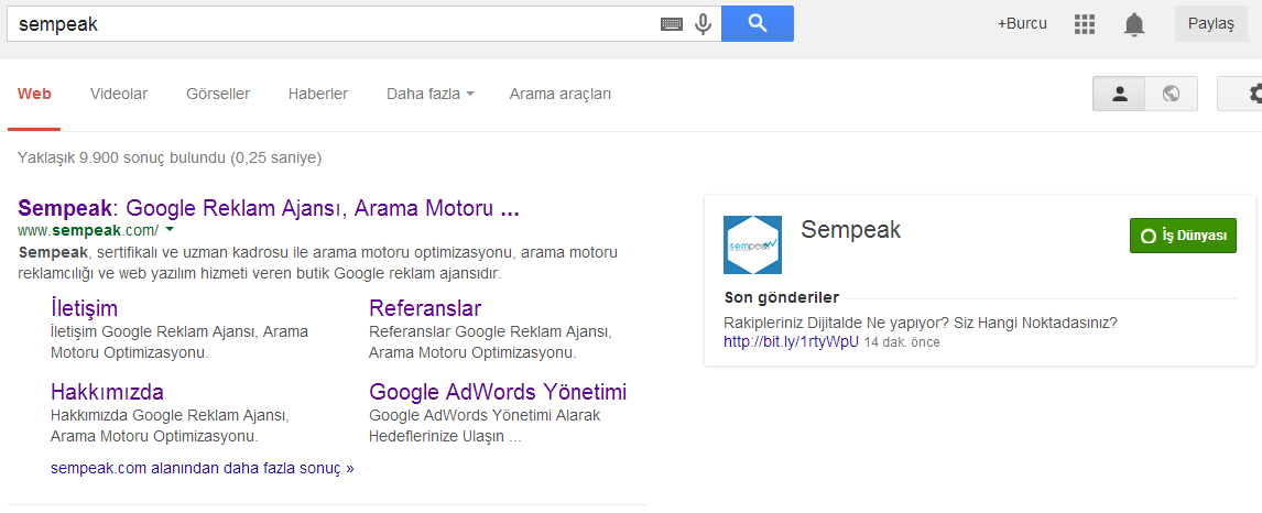 Google’ın bir öteki sağladığı avantaj ise paylaştığımız son içeriği kullanıcılara gösteren “Bilgi Grafiği” vasıtayı. Aranan kelime ile alakalı neticelerin geldiği ekranın sağ tarafında yer alan kısımda, işletme hakkında bilgilerin haricinde, markanın Google+ profili var ise yaptığı son paylaşımda burada yer alıyor. Bilgi Grafiği Tüm bunları göz önünde bulundurduğumuzda, kullanıcılara kampanya ve fırsatlarınızı duyurabilmeniz için Google+ profilinizi de aktüel yakalamanız, arama neticelerinden geri dönüş almanıza imkân sağlayacaktır.