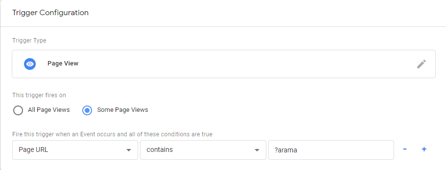 Etiketin yalnızca arama sayfasında çalışması istendiği için trigger da uygun şekilde düzenlenmelidir. Sitelerin arama sayfalarında URL, genellikle arama terimi ile beraber değişebilmektedir. Değişen URL içinde arama terimini kapsayan anahtar kelime kelime her ne ise trigger oluşturulurken kullanılabilir.