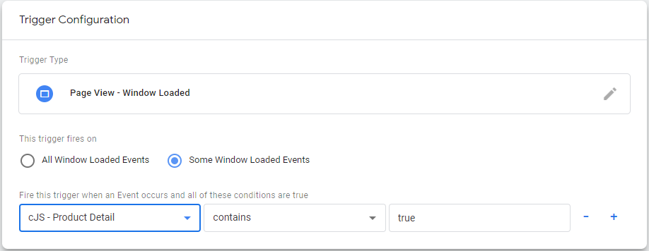 Etiketin yalnızca ürün sayfasında çalışması için trigger yapılandırmasının da buna uygun şekilde yapılması gerekmektedir. Her ürün sayfasında URL değişebilir ve sabit bir anahtar kelime ile takip edilemeyebilir. Bu durumda yine “Custom Javascript” yardımı ile yazılan bir değişken kullanılabilir.