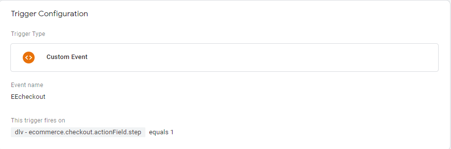 “Cart” etiketinin önemli noktası sepet sayfasında çalışan bir trigger’a sahip olmasıdır. Bu trigger’ı tanımlarken datalayer yapısından yararlanmakta büyük fayda vardır. Sepet sayfası datalayer yapısında “Checkout Step 1” adımı ve “EEcheckout” (genelde) event’i oalrak tanımlanmış olur. Datalayer’da “EEcheckout” event’i çalıştığında ve bu event’in “Step” attribute’u 1 olduğunda çalışması gerekmektedir. Buna uygun bir trigger yapısının kurulması önem arz etmektedir. Bunun için trigger’ın “Custom Event” tipinde olmasına dikkat edilmelidir.