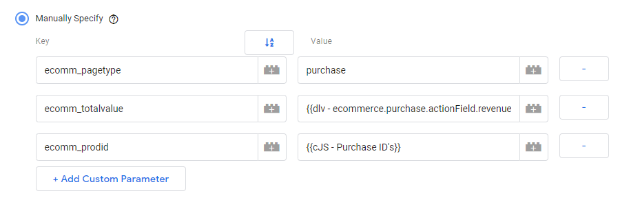 Satın alma işleminin yapılmış olduğu sayfada çalışması istenen etiket “Purchase Page” etiketidir. Kurulumu diğer etiketlerle hemen hemen aynı olup “Custom Parameters” kısmında “ecomm_pagetype”, “ecomm_totavalue” ve “ecomm_prodid” anahtar kelimeleri gönderilebilir. “ecomm_totalvalue” anahtar kelimesinin değeri olarak datalayer’dan toplam gelirin çekildiği bir “Datalayer Variable” değişkeni kullanılabilir. Datalayer büyük oranda faydalı olacaktır. Sipariş içindeki tüm ürünlerin çekilerek bir array haline getirilmesi için de “Custom Javascript” değişkeni kullanılabilir. Bu değişken sayesinde satış sayfasındaki tüm ürünlerin kimlik numarası bir array haline getirilir ve “ecomm_prodid” anahtar kelimesinin karşısına değer olarak girilir.