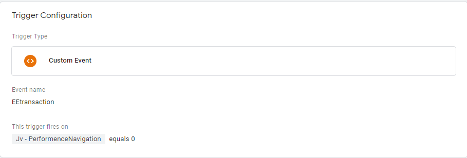 “Purchase Page” etiketinin sadece satın alım sayfasında çalışmasını sağlamak için uygun bir trigger kurulumu yapılmalıdır. Bu sayfa datalayer yapısında “EEtransaction” (veya benzer isimli, örneğin; “Transaction”) event’i ile gönderilmekte olup “Custom Event” tipindeki bir trigger ile bu event’i yakalamak mümkündür. Ayrıca etiketin bu sayfada birden fazla çalışma ihtimaline karşın sayfanın “Performance Navigation” değerinin de 0’a eşit olması şartı koşulması faydalı olacaktır. Aşağıda görmüş olduğunuz “JS – Performance Navigation” değişkenini bir javascript değişkeni olarak tanımlayabilirsiniz. Bu değişkene de “performance.navigation.type” değerini atarsanız size sayısal değer döndürerek sayfanın yüklenmesi ile ilgili detaylı bilgi verecektir. Buradaki 0 değeri ise sayfanın 1 defa yüklendiğini temsil etmektedir.