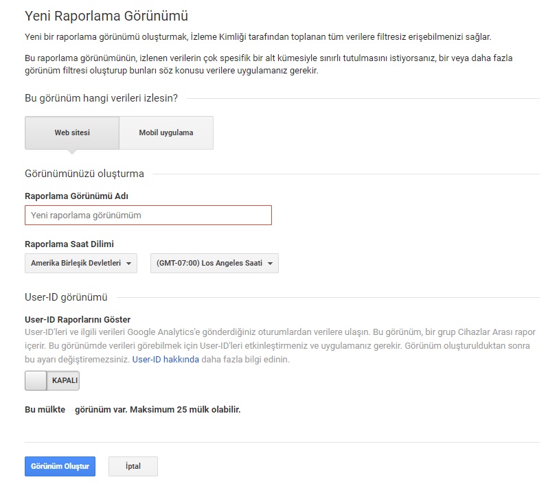 - Ardından açılan yeni sekmede, yeni görünümün ismi belirlenir (“User ID View” veya benzeri olması tavsiye edilir), raporlamanın yapılacağı saat dilimi seçilir, “User ID Raporlarını Göster” kısmındaki switch butonu “Açık” olarak ayarlanır ve son olarak “Görünüm Oluştur” butonuna tıklanarak işlem tamamlanır.