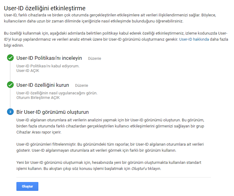 - Açılan sekmedeki talimatlar takip edilir, üç aşamalı etkinleştirme adımlarının sonuncusu olan “Bir User-ID görünümü oluşturun” bölümünden “Oluştur” butonuna tıklanır.