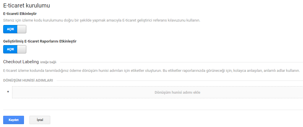 - Açılan yeni sekmedeki “E-ticareti Etkinleştir” ve “Geliştirilmiş E-ticaret Raporlarını Etkinleştir” kısımlarının altındaki switch butonları “Açık” konuma getirilir. “Dönüşüm Hunisi Adımları” ise şimdilik boş bırakılabilir.
