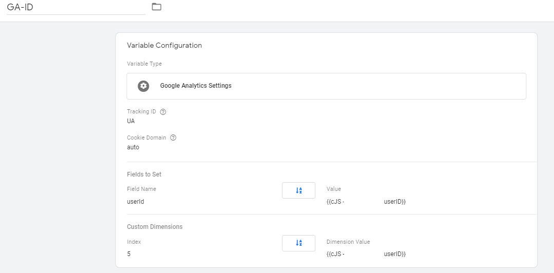- Daha önceden tanımlanmış olan, Google Analytics Tracking ID değerini içeren ve GTM ile GA arasındaki bağlantıyı sağlayan “Google Analytics Setting” tipindeki değişkenin içine eklenir. Eklenirken “Field to Set” alanındaki “Value” kısmına, herhangi bir “Field Name” ile eklenir. Aynı şekilde “Custom Dimensions” alanındaki “Value” kısmına da eklenir fakat burda dikkat edilmesi gereken, “Index” kısmına GA User ID görünümünde tanımlanan özel boyutun indeks numarasının eklenmesidir.