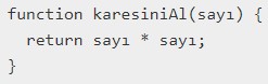 Yukarıdaki örnek, bir sayının karesini alma işlemini gerçekleştiren bir fonksiyon yapısına aittir. Bu fonksiyonda “sayi” ifadesi bir parametredir. Parametreler bu örnekteki gibi ilkel şekilde oldukları gibi bir nesne halinde de olabilir. Nesne halinde olması demek “array” cinsinden tanımlanmış olması gerektiği anlamına gelir. Fonksiyonun tanımlandığı kural boyunca array içindeki değerlerin döndürülmesi mümkün olacaktır. Aynı şekilde bir fonksiyon başka bir fonksiyon içinde parametre olarak da kodlanabilir. Matematik işlemlerinde olduğu gibi, f(f(x)) mantığıyla çalışacaktır.