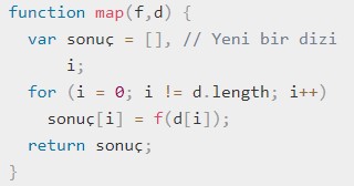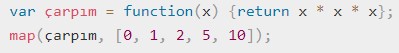 Değişken olarak tanımlanan “çarpım” fonksiyonu, “map” fonksiyonunun içindeki “f” parametresiyle değiştirilmiş ve başka bir fonksiyonda parametre özelliğini almıştır. “map” fonksiyonundaki “d” parametresi yerine de “[0,1,2,5,10]” arrayi iletilmiştir. “map” fonksiyonu sonucunda “[0,1,8,125,1000]” değerlerine sahip array dönecektir.