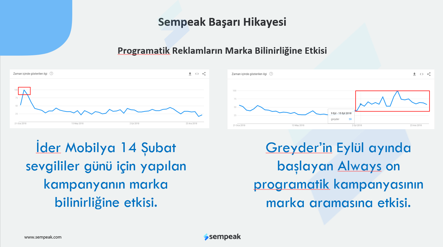 Sempeak, Programatik reklamlar ile hem performans pazarlaması hem de branding kampanyaları mevzusunda alıcılarına hizmet verebiliyor. Daha evvel yaptığımız 2 zaferli misali bu blog yazımızda paylaşıyoruz. İder Mobilya için 14 Şubat sevgililer gününe özel yapılan programatik reklamlar sayesinde markanın aranma hacmi trends bilgilerinde görüldüğü biçimde çoğalmıştır. Aynı biçimde Greyder’in always on devam eden programatik kampanyalarının marka öğrenilirliğine katkısı alttaki görselde görülmektedir.