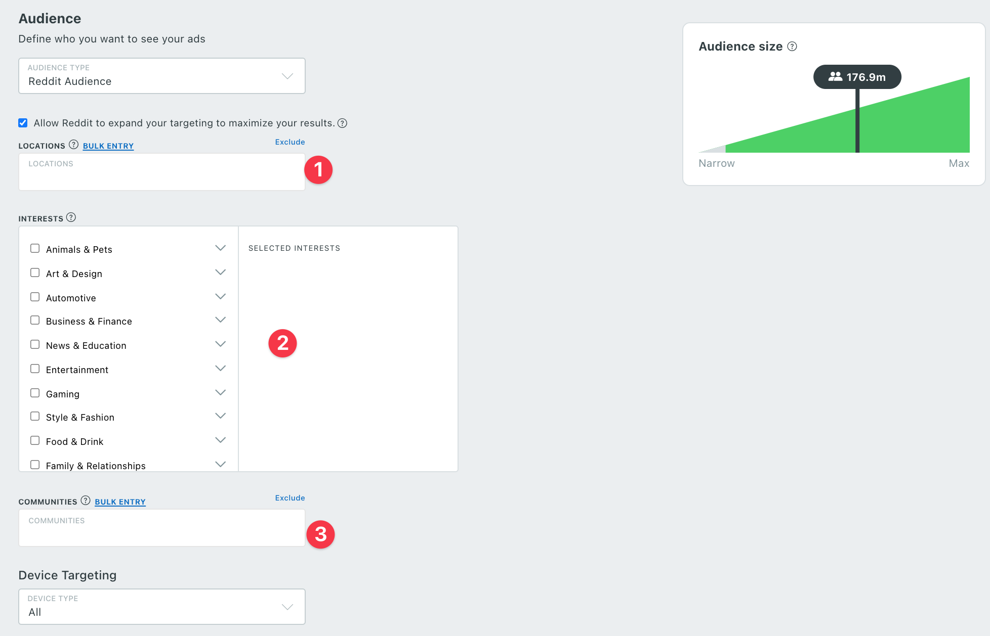 Kampanya seviyesinden sonra reklam grubu seviyesinde ise reklamınızı yayınlamak istediğiniz ülkeyi veya ülkeleri seçmelisiniz. Reklamınızı hangi ilgi alanlarına sahip veya hangi subredditleri takip eden (/r) insanlara yayınlamak istediğinizi seçtikten sonra günlük bütçenizi de ayarlayarak reklam grubu seviyesini tamamlamış olacaksınız.