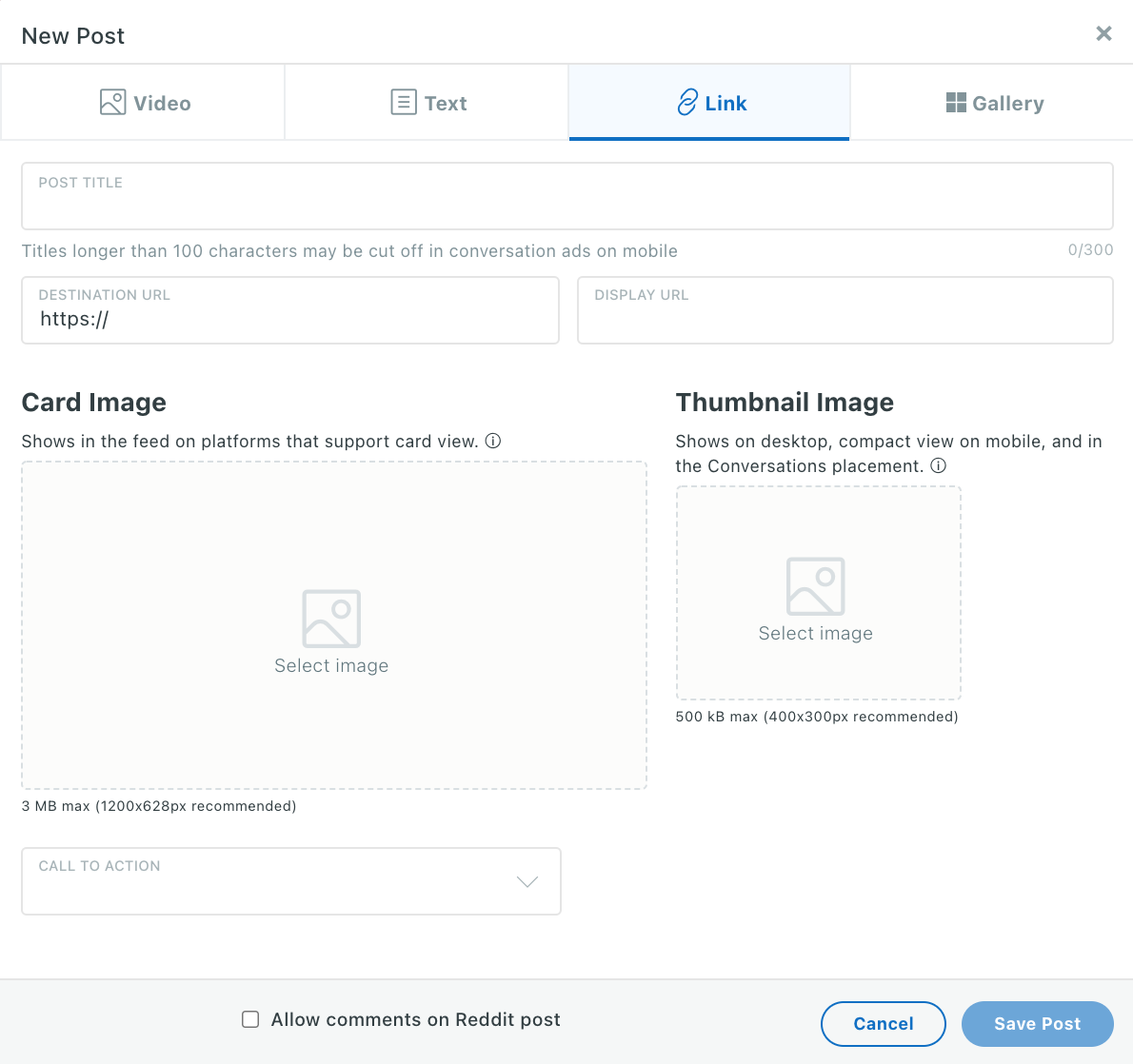 Reklam seviyesinde ise insanların karşısına nasıl kreatiflerle çıkmak istediğinizi ayarlamanız gerekiyor. Eğer reddit hesabınızda daha önce “post” yayınlamadıysanız, “Creative” başlığı altındaki “Create New Post” butonuna tıklayarak 4 farklı kreatif seçeneğinden size ve kampanyanızın hedeflerine uygun olanı seçin ve sonrasında kaydetmeyi unutmayın.