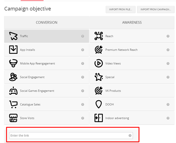1.MyTarget platformuna https://target.my.com/ linkinden abone olup ödeme usulünü girdikten sonra ‘Create Campaign’ kısmına geldiğimizde emelinize uygun bir ‘Objective’ seçip reklamını yapacağınız sitenin adresini girin.