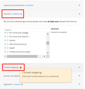 3. MyTarget platformunda Interest veya arama terimlerine kadar ayrıntılı amaçlama yapabildiğimiz ‘Context Targeting’ gibi ehemmiyetli amaçlama alternatifleri mevcuttur.Bu kısımda reklamlarınızı göstereceğiniz bireyleri spesifik olarak ayırabilirsiniz.