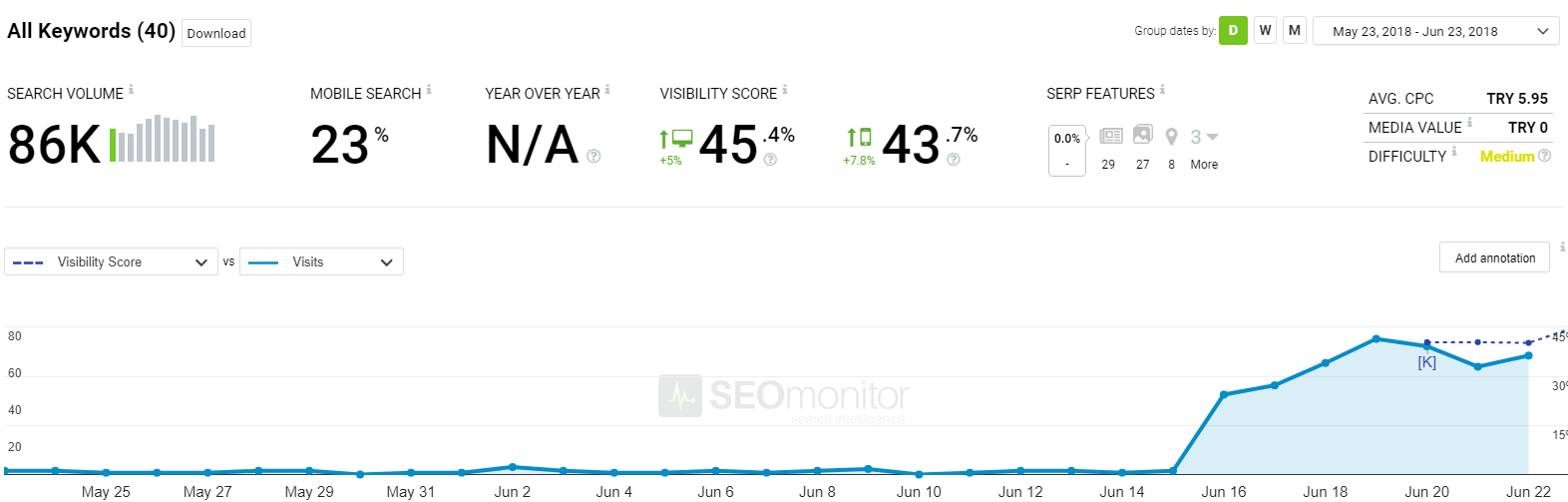 Fırsat Puanına ek olarak, SEOmonitor anahtar kelimenin zorluk yüzdesini hesaplar ve bunu renkli bir çubukla görüntüler.
