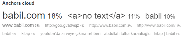 Yorumum: Site dışında yapılan link inşası çalışmalarında yukarıda görüldüğü üzere; Babil.com’da “kitap” kelimesini sadece %1’lik gibi küçük bir oranda kullanılmışken, kitapyurdu.com’da neredeyse her jenerik kelimede “kitap” kelimesi geçiyor.