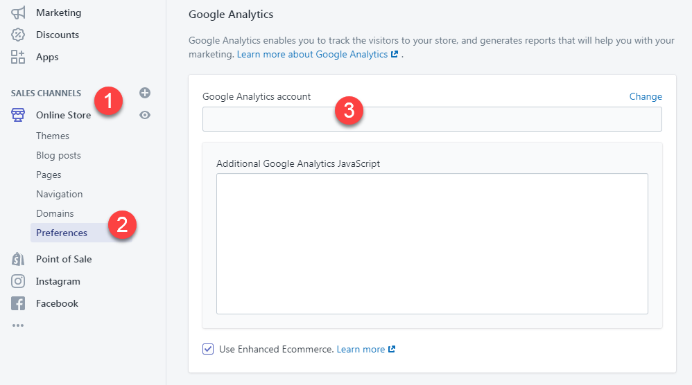 Öncelikle Shopify’ ın yönetim paneline giriş yapıyoruz. Daha sonrasında ise Online Store(1) ve Preferences(2) adımlarını takip ediyoruz. Google Analytics Account kısmına ise Google Analytics ID’ mizi yapıştırıyoruz.