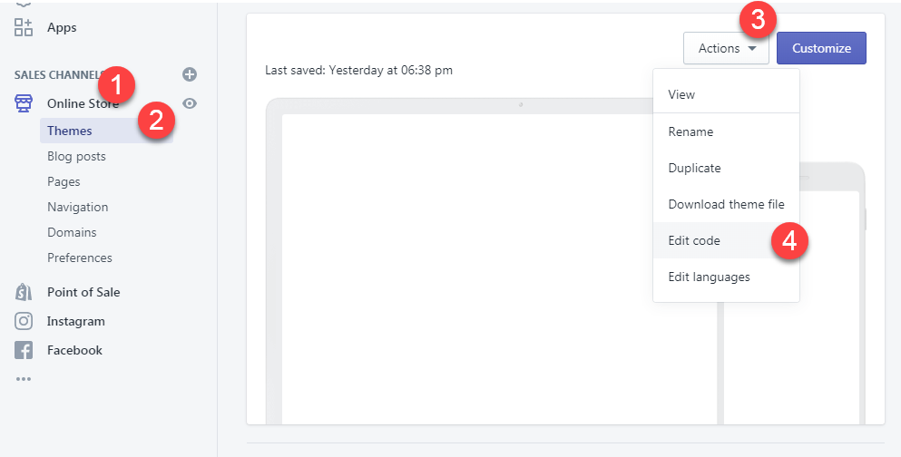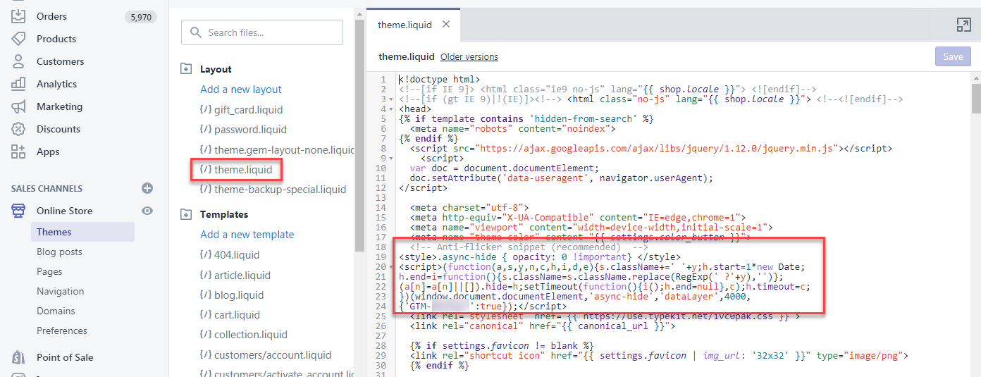 Anti-flicker kodunun eklenmesi. Google Optimize’ın problemsiz çalışması için anti-flicker kodununiçerisine eklenmesi gerekiyor. Head içerisine kod eklemek için Online Store > Themes > Actions > Edit Code bölümüne tıklıyoruz. Sonrasında da “theme.liquid” isimli dosyaya tıklayarak düzenleme moduna geçiyoruz.