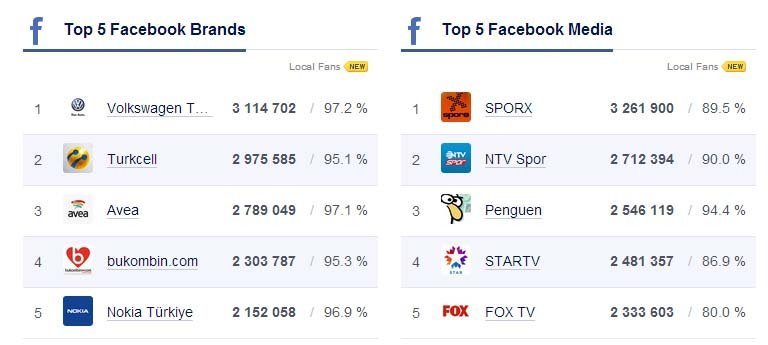 Facebook takipçi sıralamasında ilk sırayı Volkswagen Türkiye alıyor. Medya kategorisinde ise en üst sırada SporX’i görüyoruz.