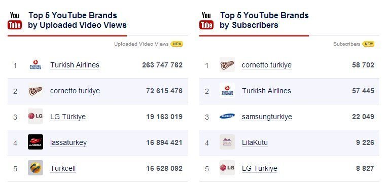 YouTube yüklenen video görüntüleme sıralamasında yüksek bir oranla ilk sırada Turkish Airlines yer alıyor. Üye sayısında ise ilk sırada Cornetto Türkiye var.