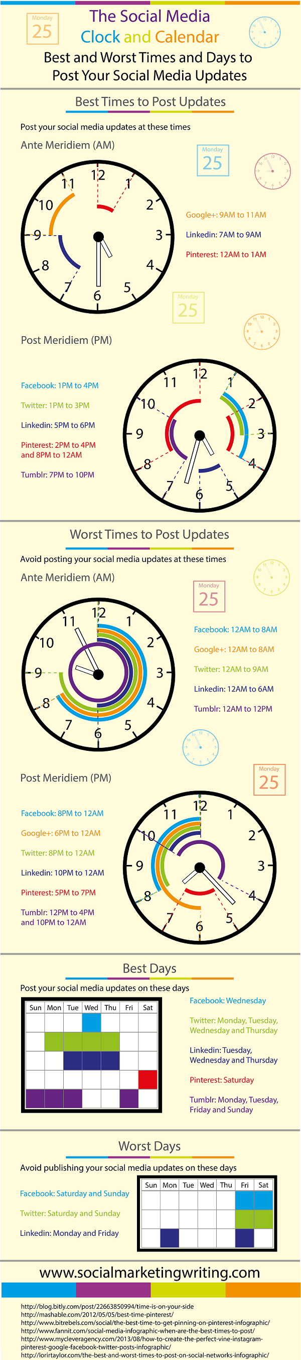 Social Marketing Writing’in yayınladığı infografikte Facebook, Twitter, LinkedIn, Google+ ve Pinterest için verilen bilgilere göre; kullanıcılar sabah saatlerinde 09:00-11:00 arası Google+’ta ve Pinterest’te ise günün ilk saatleri etkin oluyorlar. İçerik yayınlamak için en uygun zaman dilimleri ise Facebook’ta 13:00-14:00 arası, Twitter’da 13:00-15:00 arası ve Linkedin’de ise 17:00-18:00 olarak belirtilmiş.